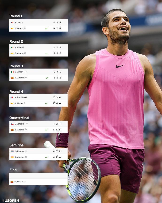 阿尔卡拉斯男单决赛将对阵辛纳和阿利亚西姆之间的胜者。